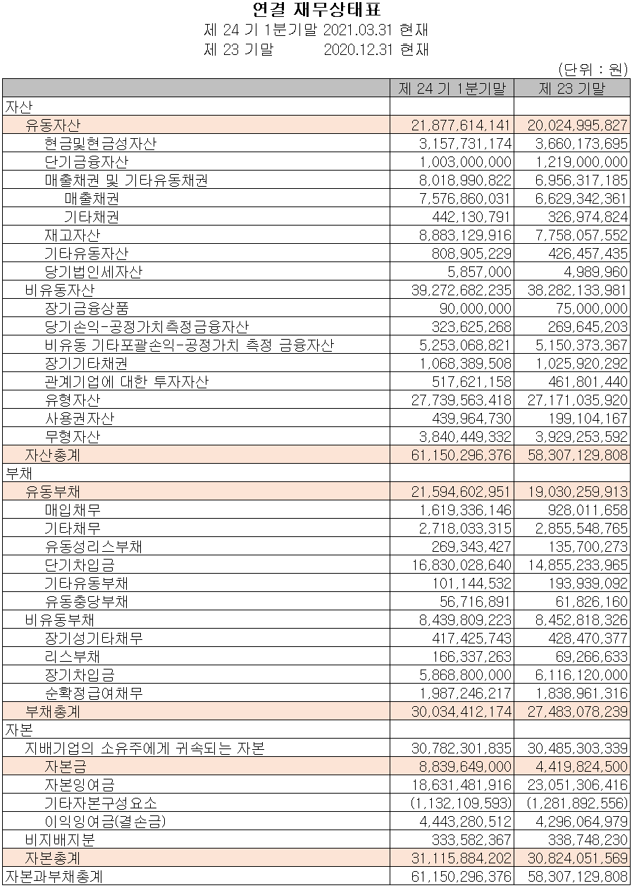 당사의 지난 1분기 자산 총계는 전기보다 4.9%(28억 원) 증가한 612억 원으로 매출채권, 재고자산 및 유형자산의 증가에 기인합니다. 부채 총계는 전기 대비 9.3%(26억 원) 증가한 300억 원으로 차입금의 증가가 있었습니다.