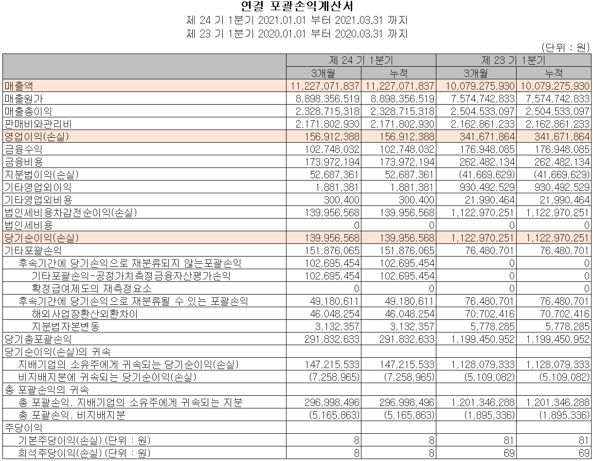 당사의 지난 1분기 자산 총계는 전기보다 4.9%(28억 원) 증가한 612억 원으로 매출채권, 재고자산 및 유형자산의 증가에 기인합니다. 부채 총계는 전기 대비 9.3%(26억 원) 증가한 300억 원으로 차입금의 증가가 있었습니다.