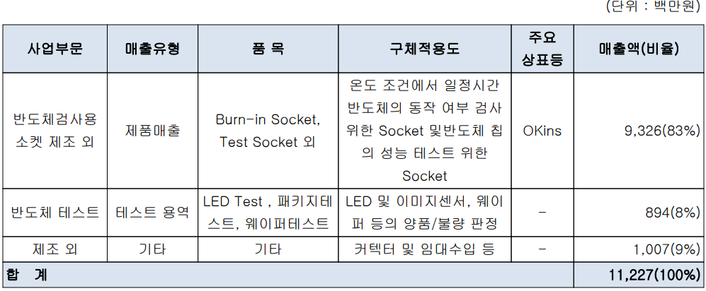 당사는 반도체 테스트용 번인소켓, 테스트 소켓의 개발 및 공급과 반테 테스트에 대한 서비스 용역을 수행하는 업무로 구성되어 있습니다. 지난 1분기 반도체 검사용 소켓 제품의 매출은 93억 원으로 전체 매출의 83%를 차지하였고, 반도체 테스트 용역 매출은 8.9억 원으로 8%의 매출 비중을 나타냈습니다.