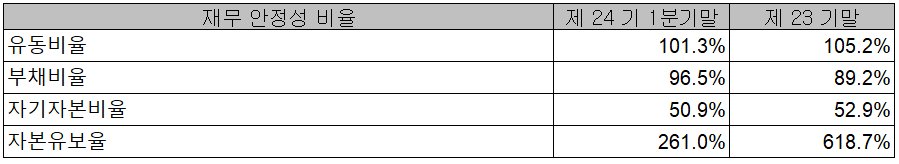 2021년 1분기 당사의 재무 안정성 비율에서는 유동비율 101.3%, 부채비율 96.5%, 자기자본비율 50.9%, 자본 유보율 261%를 기록하였습니다. 부채비율이 전기 대비 올랐으나 연간 부채비율로 보면 감소 추세에 있으며, 최근 5G 등 신규 사업을 위한 투자 및 기업 인수로 올해 부채비율은 100% 부근에서 유지될 것 같습니다.