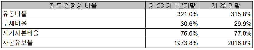 2021년 1분기 당사의 재무 안정성 비율에서는 유동비율 321%, 부채비율 30.6%, 자기자본비율 76.6%, 자본유보율 1,973.8%를 기록하면서 안정적인 재무상태를 유지하고 있습니다.