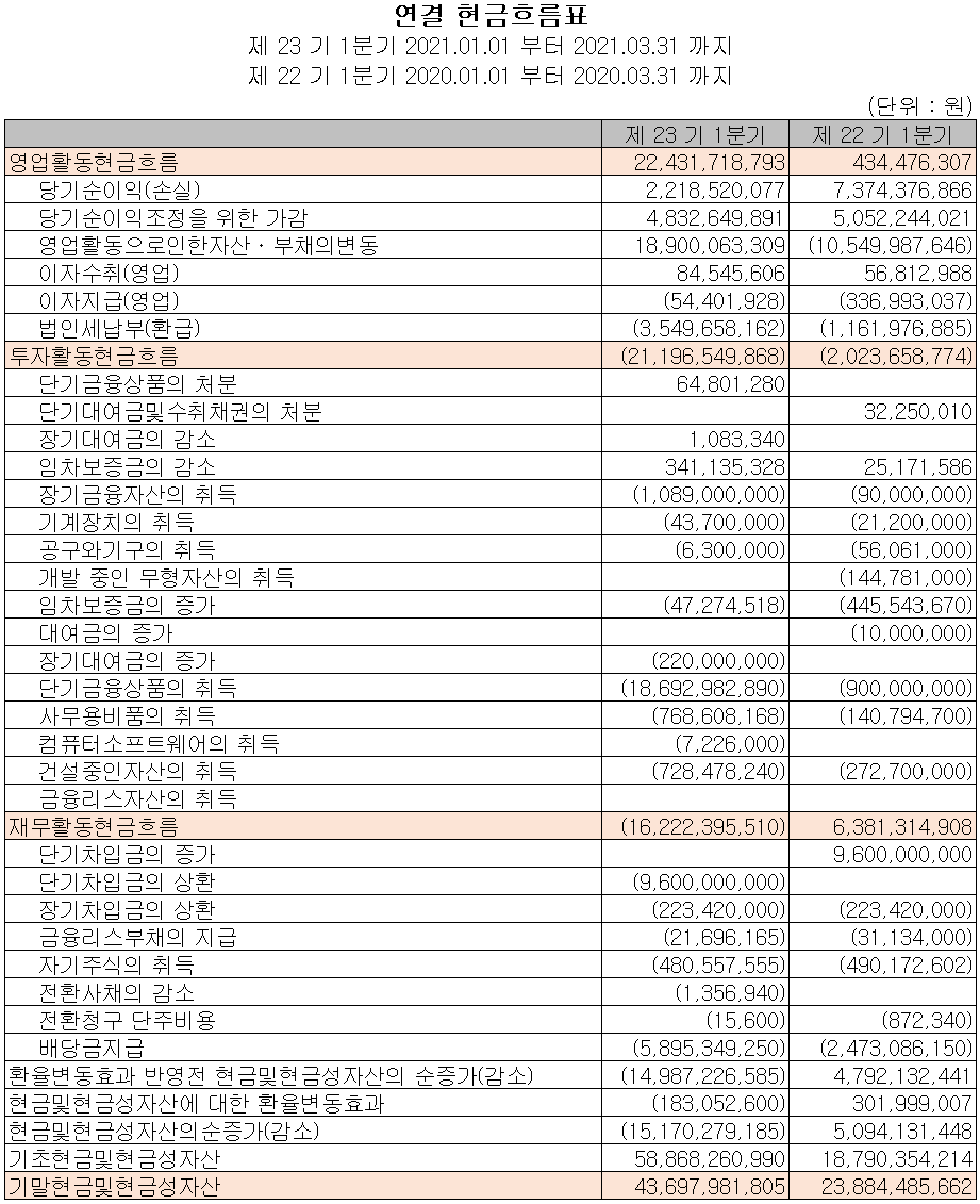 지난 1분기 당사의 영업활동 현금흐름에서는 운전 자산의 변동에 따라 총 224억 원의 현금이 유입되었습니다. 장단기 차입금을 조달하여 부채를 상환하고, 배당금을 지급하였으며 금융상품 및 유형 자산의 취득이 있었습니다. 2021년 1분기 현금 및 현금성 자산은 전년 동기 대비 198억 원 증가한 437억 원을 보유하고 있습니다.
