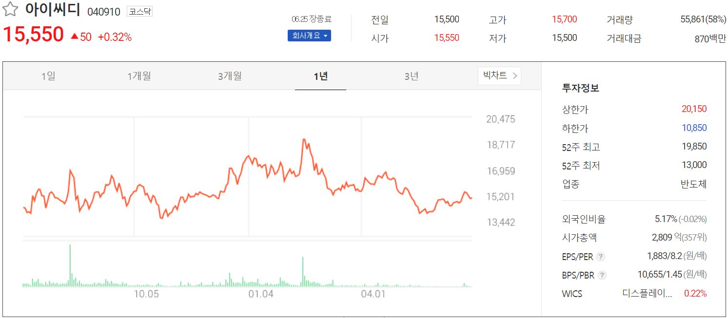 6월 25일 장 종료 기준 당사의 주가는 전 거래일보다 0.32% 오른 15,550원에 거래를 마쳤습니다. 외국인 비중은 5.17%이며 시가 총액 2,809억 원으로 코스닥 시총 기준 357위 종목입니다.