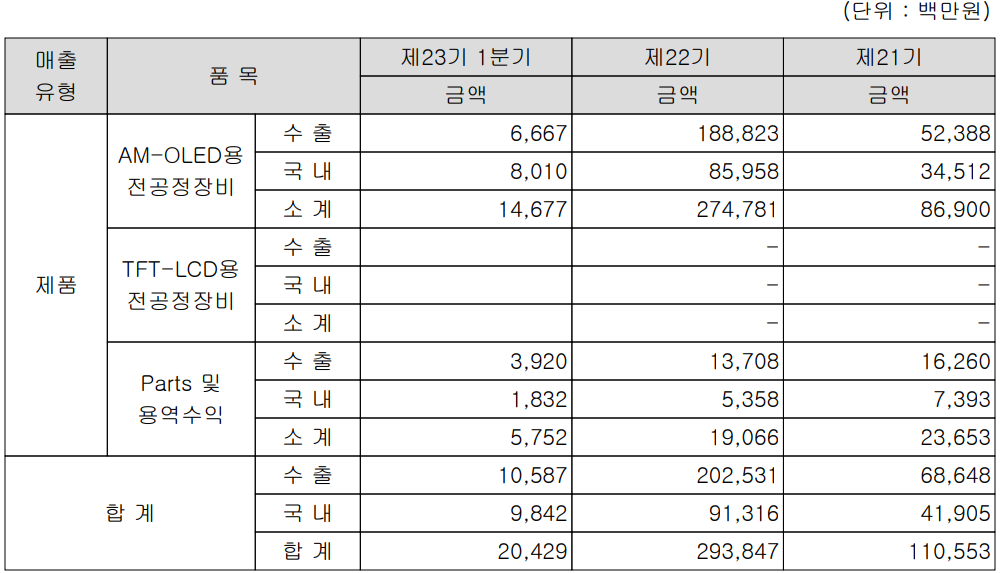 당사는 AMOLED 제조 공정에 필요한 장비를 개발, 공급하는 단일 사업부문으로 주요 제품에는 HDP Etcher, Plasma Asher, 증착기 및 파트와 용역 등으로 구분됩니다. 지난 1분기 HDP Etcher의 매출은 80억 원으로 전체 매출의 39.21%를 차지하였으며, 증착기는 67억 원으로 32.63%, Parts 관련 매출은 25억 원으로 12.15%, 용역 매출은 33억 원으로 16.01%의 매출 비중을 나타냈습니다.