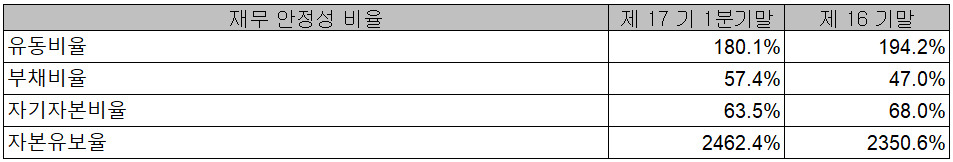 2021년 1분기 당사의 재무 안정성 비율에서는 유동비율 180.1%, 부채비율 57.4%, 자기 자본비율 63.5%, 자본 유보율 2,462.4%를 기록하면서 안정적인 재무구조를 유지하고 있습니다.