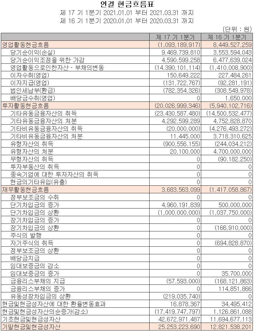 지난 1분기 영업활동 현금흐름에서는 운전 자산의 변동에 따라 총 11억 원의 현금이 유출되었으며, 차입금을 조달하여 부채를 상환하였고, 금융자산 및 유형 자산의 취득이 있었습니다. 2021년 1분기 말 기준 현금 및 현금성 자산은 전년 동기 대비 124억 원이 증가한 253억 원을 보유하고 있습니다.
