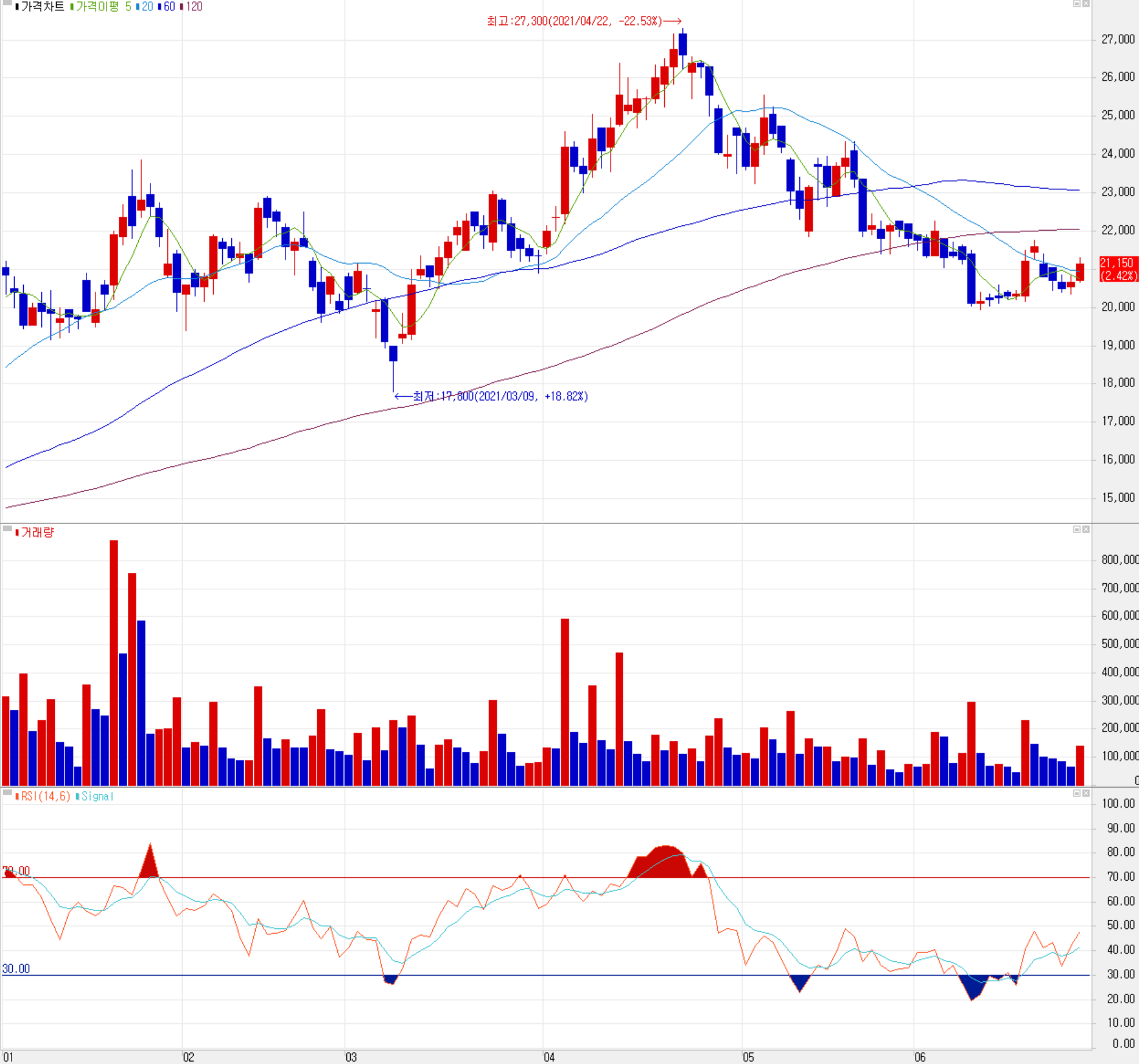 6월 25일 장 종료 기준 당사의 주가는 전 거래일보다 2.42% 오른 21,150원에 거래를 마감했습니다. 외국인 비중은 2.38%이며, 시가 총액 2,310억 원으로 코스닥 시총 기준 465위 종목입니다.