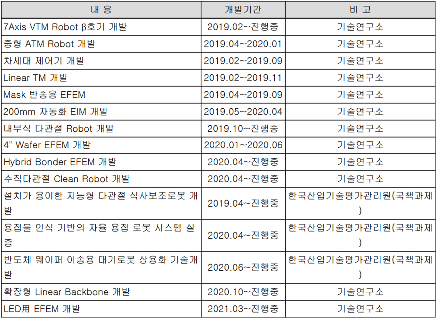 당사는 최근 3년간에도 전체 매출액의 2~3% 대에 달하는 비용을 연구개발에 투입하면서 반도체 공정용 다관절 로봇, 공정 자동화 등의 연구 개발을 지속하고 있습니다.