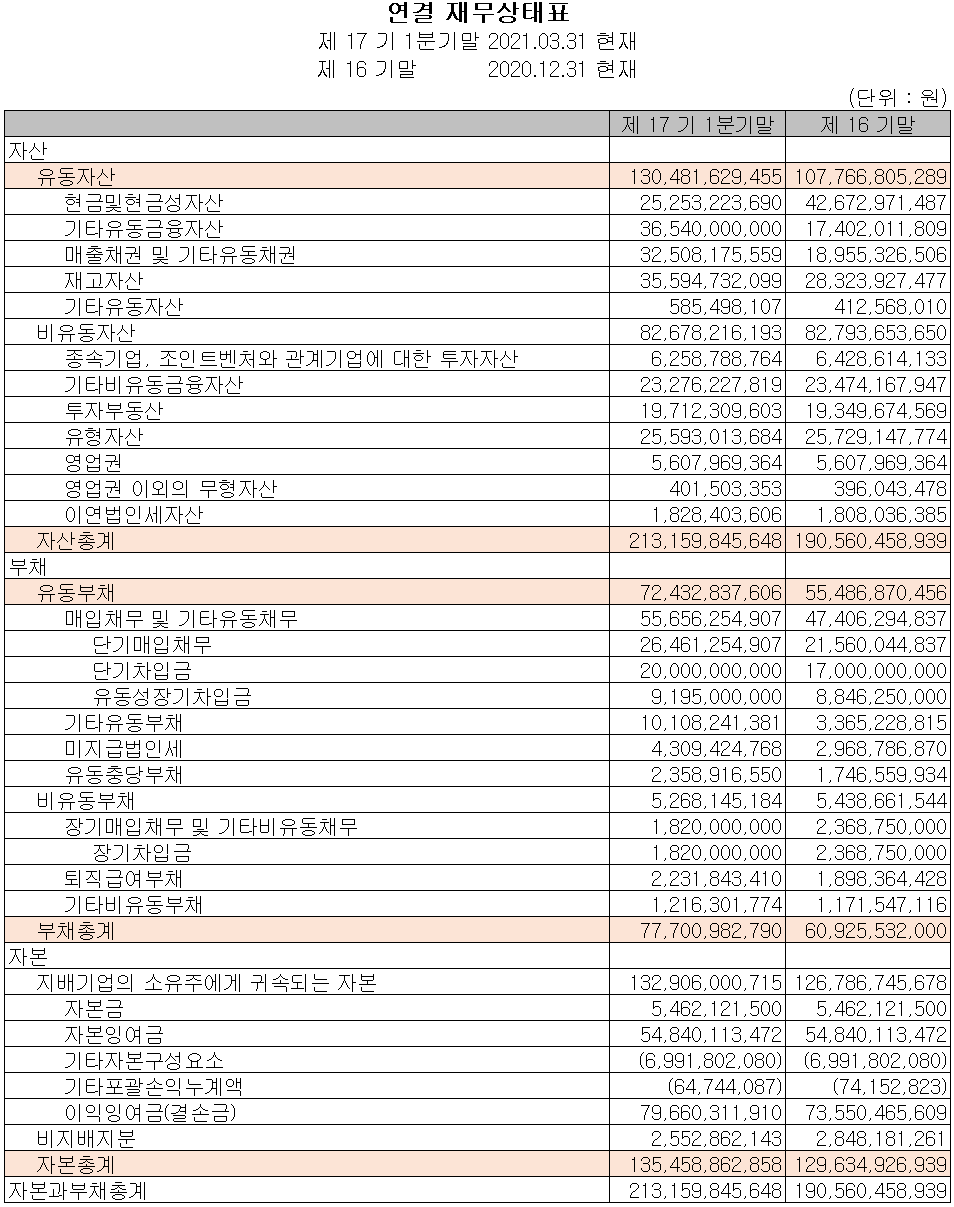 지난 1분기 당사의 자산 총계는 전기보다 11.9%(226억 원) 증가한 2,132억 원으로 금융자산, 매출채권 및 재고자산의 증가에 기인합니다. 부채 총계는 27.5%(168억 원) 증가한 777억 원으로 매입채무 및 차입금의 증가가 있었습니다.