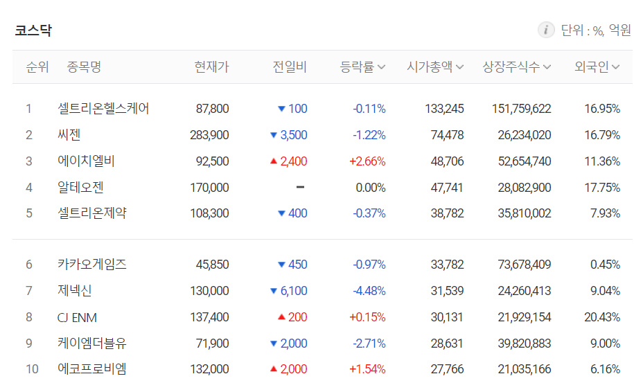 시가총액 상위 종목 중 삼성전자도 6만원선을 내주면서 0.83% 하락한 59500원에 거래를 마쳤고, SK하이닉스, 현직 임원의 횡령 혐의 기소 소식이 전해진 삼성바이오로직스 및 현대차, 삼성 SDI 등이 2%가 넘는 비교적 큰 폭의 하락세를 보였습니다. 반면 네이버, LG화학 및 셀트리온은 소폭 상승했습니다.