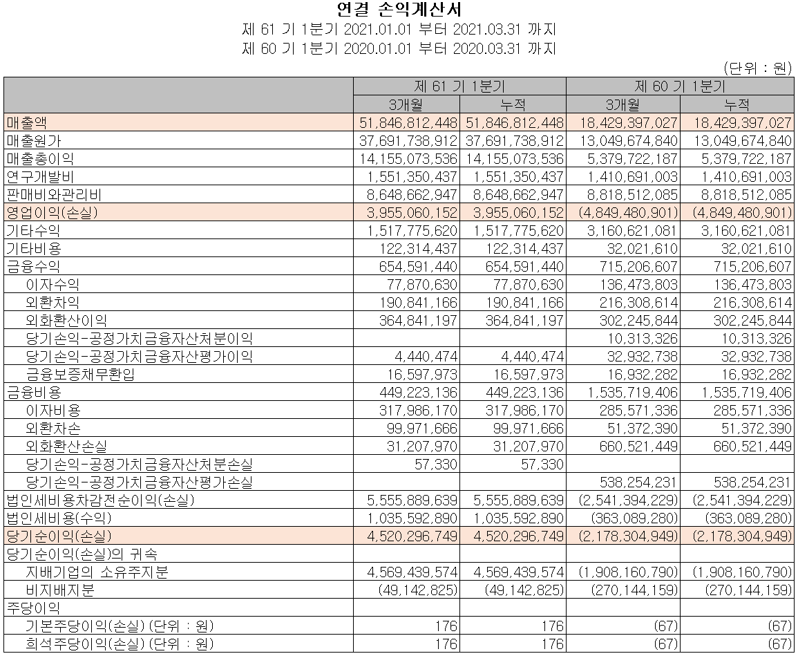 지난 1분기 당사의 실적은 매출액 518억 원으로 전년 동기 대비 181.3% 증가했고, 영업이익 40억 원, 당기순이익 45억 원으로 흑자 전환했습니다.