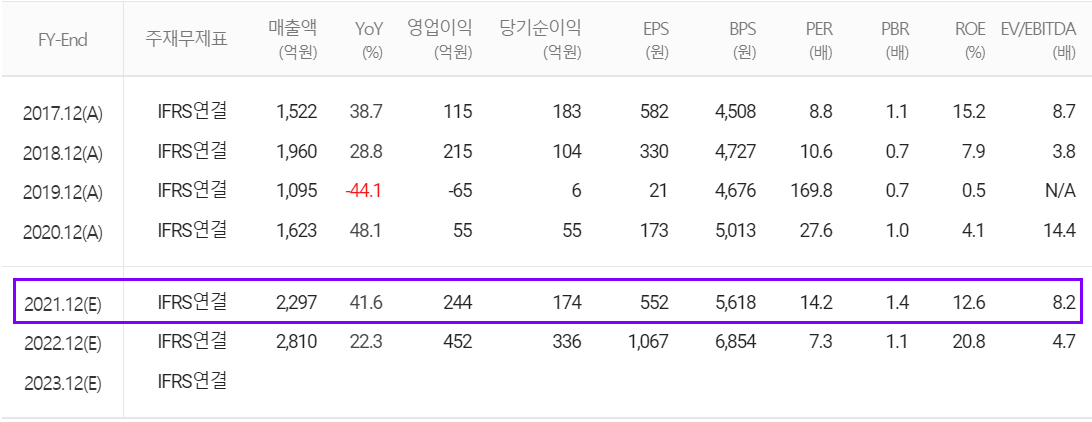 당사의 2021년 연간 예상 실적에서는 매출액 2,297억 원으로 전년 대비 41.6% 증가했고, 영업이익은 244억 원으로 343.6% 증가, 당기순이익은 174억 원으로 216.4% 증가할 것으로 추정했습니다. 번인 테스터의 국내 시장 점유율 70%로 과점을 통한 지속적인 매출과 웨이퍼 테스터의 국산화율이 증가하면서 당사의 전반적인 실적이 개선될 것으로 전망합니다.