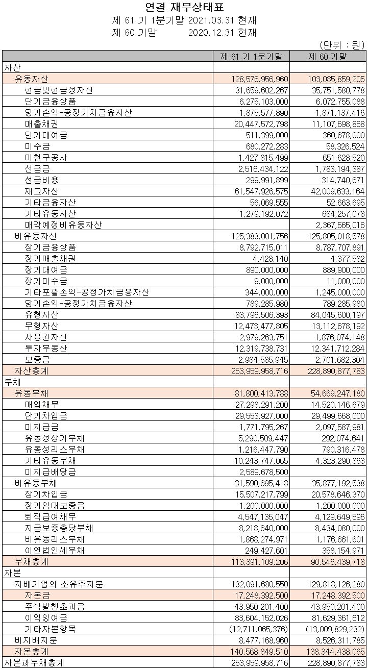당사의 지난 1분기 자산 총계는 전기보다 11%(251억 원) 증가한 2,540억 원으로 매출 채권 및 재고 자산의 증가에 기인합니다. 부채 총계는 25.2%(228억 원) 증가한 1,134억 원으로 매입 채무, 리스 부채 및 유동성 부채의 증가가 있었습니다.