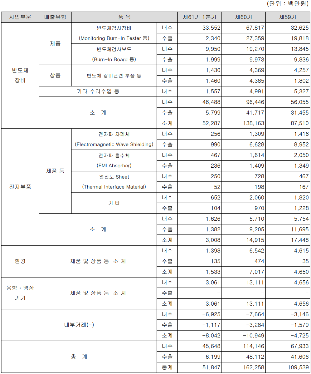 당사의 연결 기준 사업부문은 반도체 웨이퍼 테스터 및 번인 테스터를 주력으로 하는 반도체 장비 사업부문, 전자파 차폐 및 흡수제 등을 생산하는 전자부품 사업부문, 환경 시설 설비 등을 하는 환경 사업부문 그리고 해외 하이엔드 오디오 브랜드의 수입 및 판매를 담당하는 음향 및 영상 기기 사업부문으로 구성되어 있습니다. 지난 1분기 연결회사의 주력 사업인 반도체 장비 부문의 매출은 523억 원으로 전체 매출액의 87.3%를 차지하였습니다. 반도체 장비 부문의 내수와 수출 비중은 각각 88.9%, 11.1%를 기록했습니다.