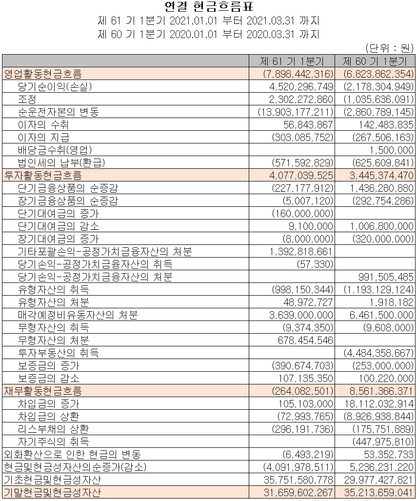 지난 1분기 영업활동 현금흐름에서는 운전 자산의 변동에 따라 총 79억 원의 현금이 유출되었으며, 차입금을 조달하여 부채를 상환하고 유형 자산의 취득이 있었습니다. 2021년 1분기 말 기준 현금 및 현금성 자산은 전년 동기 대비 36억 원이 줄어든 317억 원을 보유하고 있습니다.