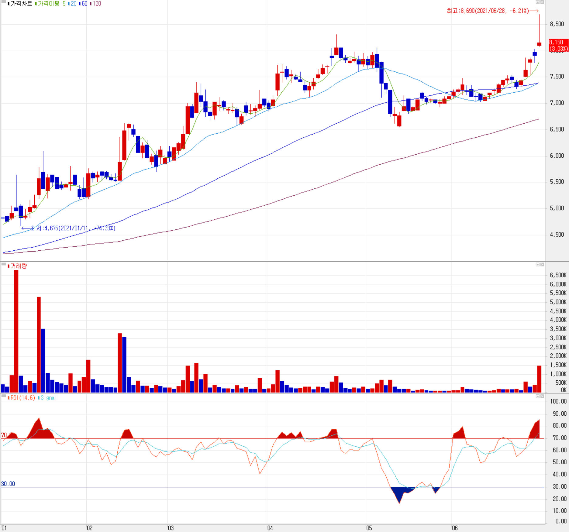 올해 들어서 꾸준히 상승하던 당사의 주가는 5월 초 공매도 재개 등 시장 변동성에 따른 영향을 받으면서 잠시 조정을 거친 후 최근까지 반등 추세를 유지하고 있습니다. 최근 수급에서는 기관과 외국인의 매수세에 상승폭을 확대하면서 오늘 6월 28일 장중 신고가인 8,690원을 기록하였습니다. 당사의 예상 실적 및 최근 사업 현황과 차트 소견을 종합한 개인적인 목표주가는 10,000원으로 설정합니다.