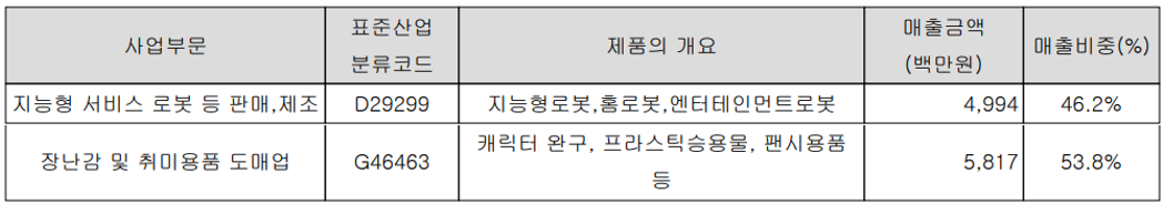 당사는 지능형 로봇 및 청소 로봇 등 홈 로봇, 엔터테인먼트 로봇 등을 제조, 공급하는 사업과 캐릭터 디자인 및 완구 사업을 영위하고 있습니다. 지난 1분기 지능형 서비스 로봇 사업의 매출은 50억 원으로 전체 매출의 46.2%를 차지하였으며, 캐릭터 및 완구 사업부문에서는 58억 원의 매출로 53.8%의 매출 비중을 기록하였습니다.