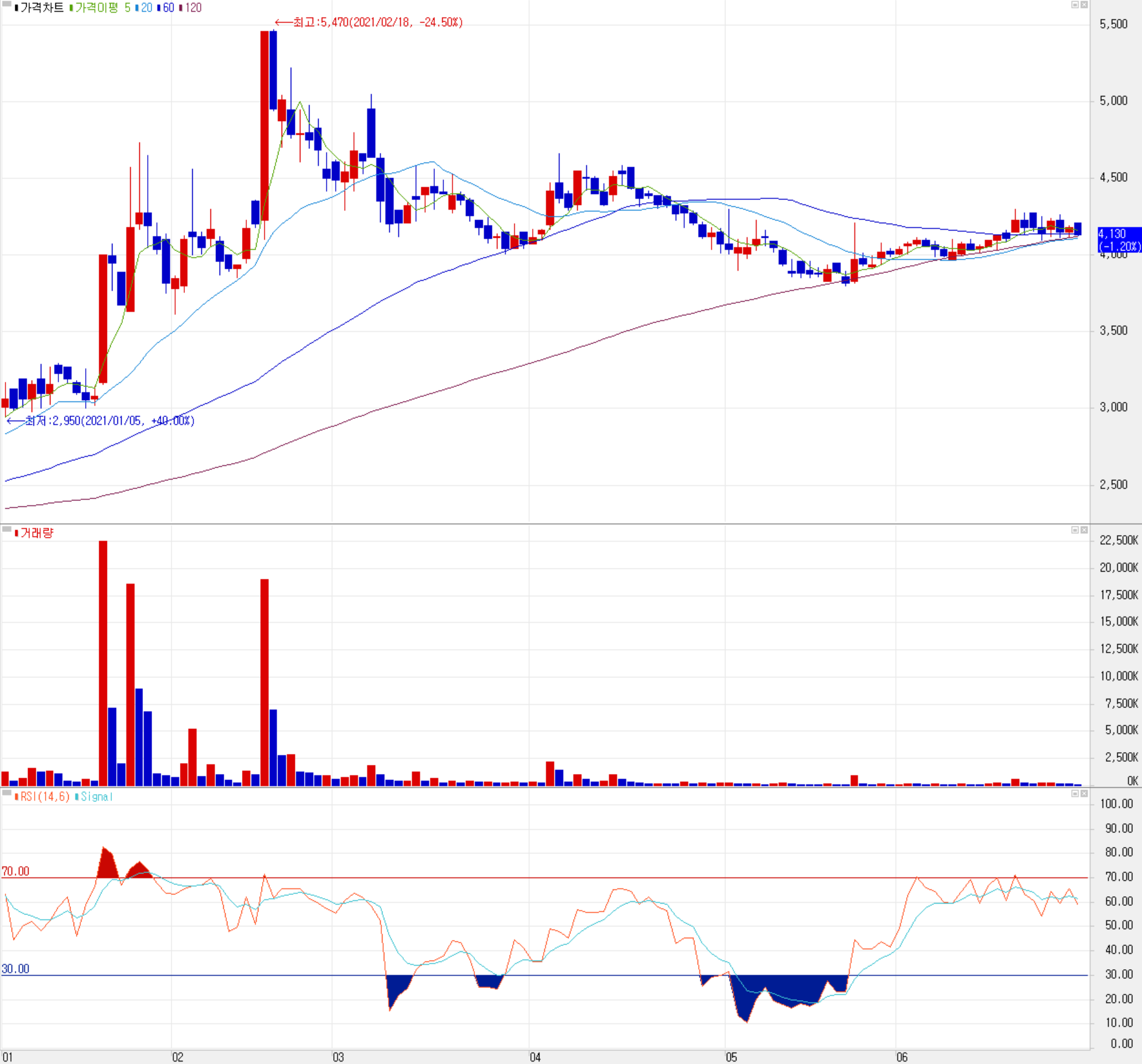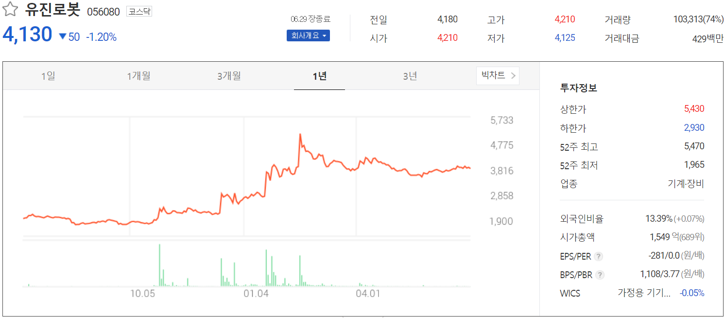 6월 29일 장 종료 기준 당사의 주가는 전일보다 1.2% 내린 4,130원에 거래를 마쳤습니다. 외국인 비중은 13.39%이며, 시가 총액 1,549억 원으로 코스닥 시총 상위 689위 종목입니다.
