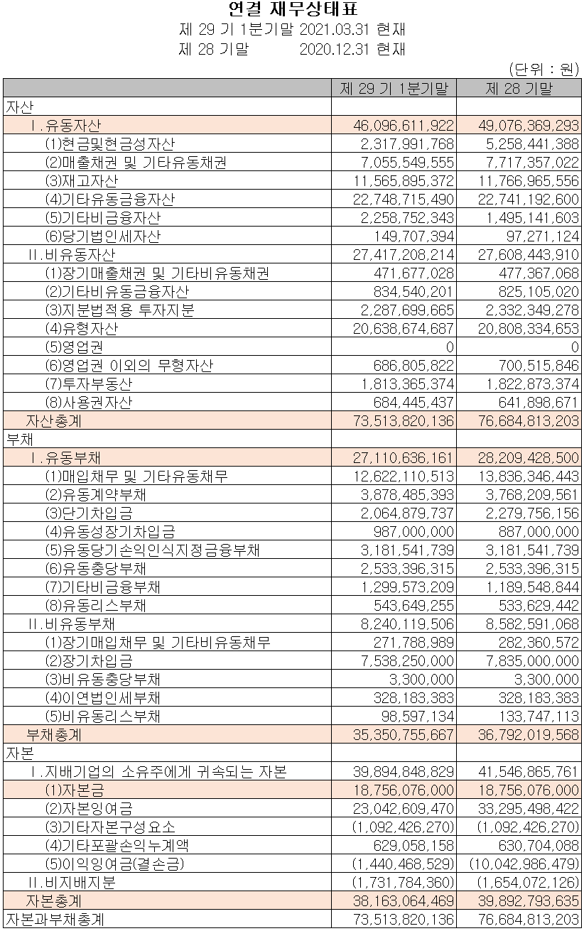 당사의 지난 1분기 자산 총계는 전기보다 4.1%(32억 원) 감소한 735억 원으로 현금 및 현금성 자산과 매출 채권의 감소에 기인합니다. 부채 총계는 3.9%(14억 원) 감소한 354억 원으로 매입 채무의 감소가 있었습니다.