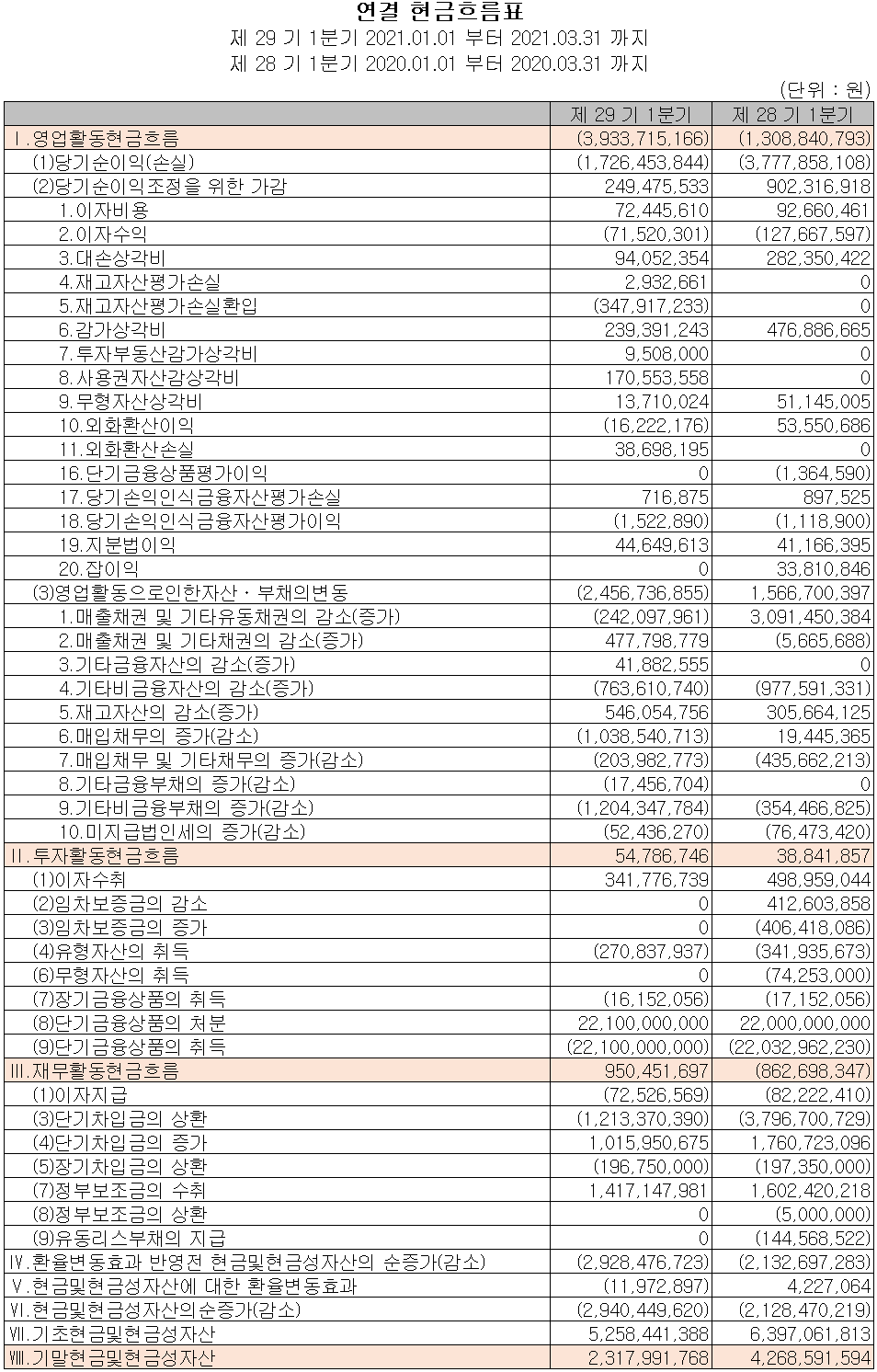 지난 1분기 영업활동 현금흐름에서는 당기순손실 및 운전자산의 변동에 따라 총 39억 원의 현금이 유출되었습니다. 차입금을 조달하여 부채를 상환하고, 유형 자산의 취득이 있었습니다. 2021년 1분기 말 현금 및 현금성 자산은 전년 동기 대비 20억 원 감소한 23억 원을 보유하고 있습니다.