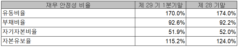 당사의 2021년 1분기 재무 안정성 비율에서는 유동비율 170%, 부채비율 92.6%, 자기 자본비율 51.9%, 자본 유보율 115.2%를 기록하였습니다. 전반적으로 부실하지는 않지만 오랜 기간 지속되는 적자로 인해 자본 유보율이 낮은 상황입니다. 매출액의 14%에 해당되는 비용을 신규 사업인 자율주행 관련 솔루션 등에 투자하면서 자금난 해소를 위해 완구사업을 분할하고, 아웃도어 플랫폼도 매각하면서 자율주행 솔루션인 로봇 사업에 집중하고 있습니다. 2021년 다양한 제품 출시와 함께 공격적인 마케팅을 진행하면서 당사의 실적도 점차 개선될 것으로 예상합니다.