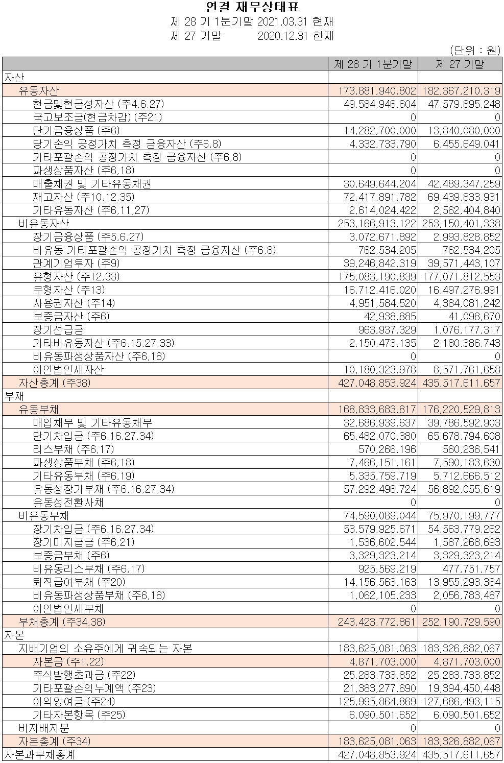 당사의 지난 1분기 자산 총계는 전기보다 1.9% 감소한 4,270억 원으로 매출 채권 및 유형 자산의 감소에 기인합니다. 부채 총계는 3.5% 감소한 2,434억 원으로 매입 채무 및 장기 차입금의 감소가 있었습니다.