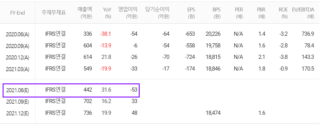 당사의 2021년 2분기 예상 실적은 매출액 442억 원으로 전년 동기 대비 31.6% 증가하고, 영업손실은 53억 원을 기록할 것으로 내다봤습니다.