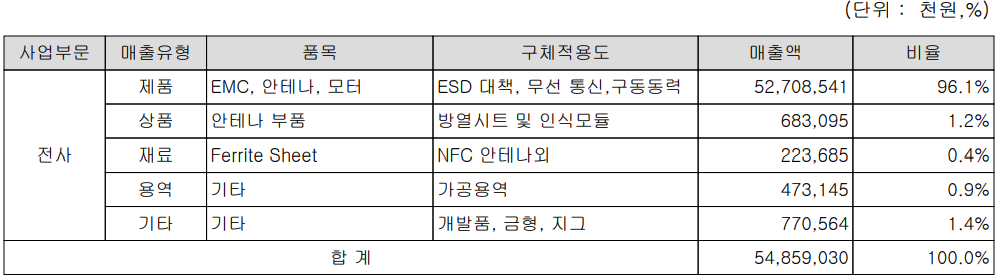 당사는 세라믹 소재 기술 기반의 전자파 자폐 제품, MLCC와 BLDC 모터를 제조, 공급하는 사업을 영위하고 있습니다. 지난 1분기 당사의 실적에서 수출과 내수의 비중은 각각 77.6%, 22.4%를 기록했습니다.
