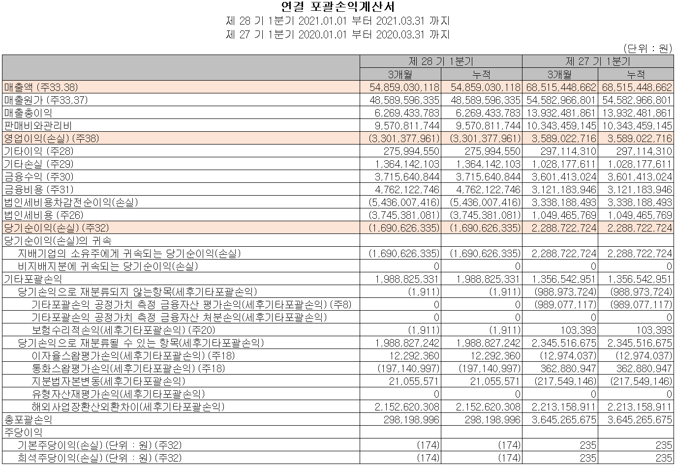 (주)아모텍 2021년 1분기 실적 - 손익계산서