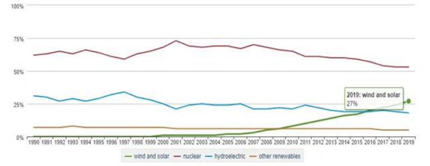 영국도 에너지원으로 볼 때 풍력과 태양광이 차지하는 비율이 2019년 기준 18.3%이고 원자력, 석유 및 석탄을 이용하는 에너지원이 30%, 가스를 이용한 화력발전이 40.7%에 이르고 있습니다.