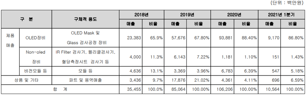 당사는 크게 OLED 제조 공정용 장비와 반도체 및 헬스케어용 검사 장비의 제조 및 공급을 영위하는 기업입니다. OLED에는 OLED 인장기, 트리머, 수동 리페어 장비 및 검사 장비 등이 있으며, 반도체 부문에는 펠리클 검사기, 비전 모듈 등이 있고, 헬스케어 부문에서는 혈당 측정 시트 검사기를 공급하고 있습니다. 지난 1분기 실적에서 OLED 부문의 매출은 92억 원으로 전체 매출의 86.8%를 차지하였으며, OLED 외 검사기 부문에서는 1.5억 원의 매출로 1.43%의 비중을 기록했습니다.