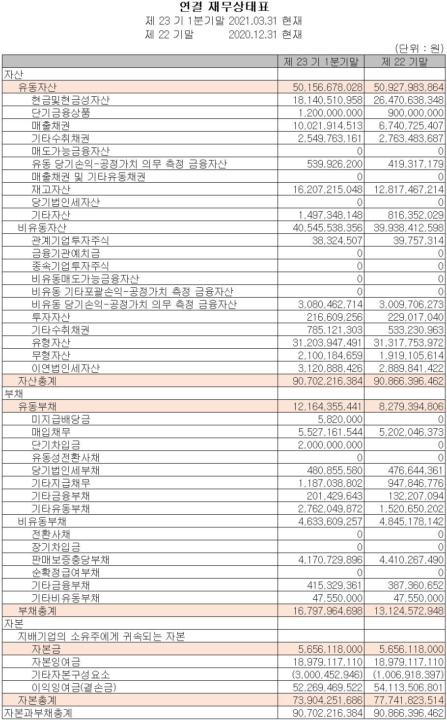 2021년 1분기 자산 총계는 전기보다 0.2% 감소한 907억 원이며, 부채 총계는 28%(37억 원) 증가한 168억 원으로 차입금 및 기타 유동성 부채의 증가가 있었습니다.