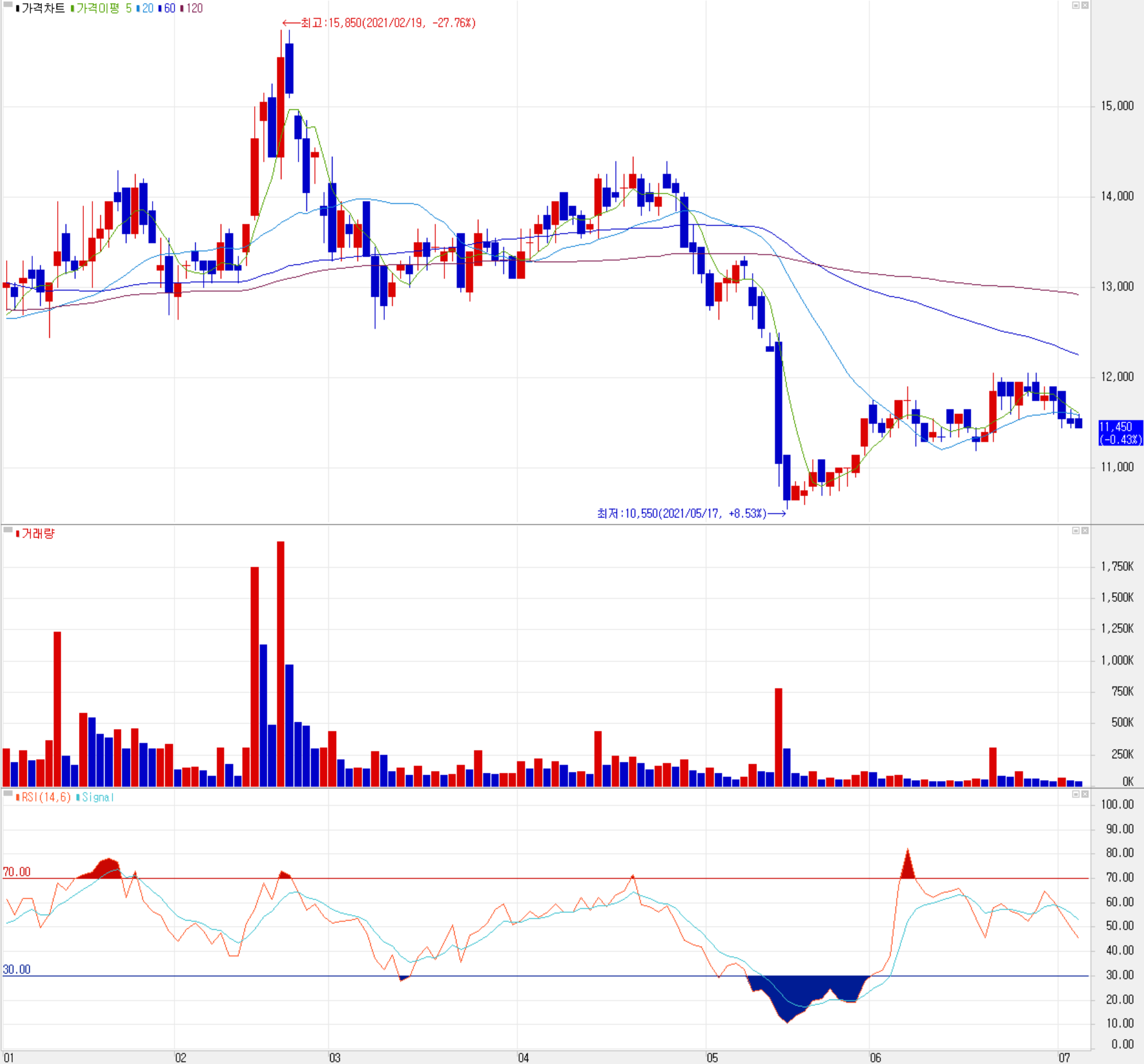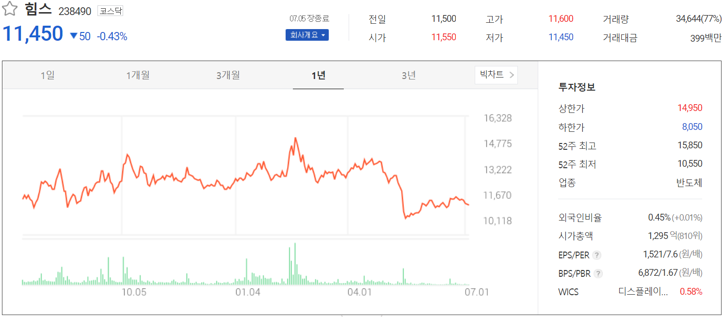 7월 5일 장 종료 기준 당사의 주가는 전 거래일보다 0.43% 내린 11,450원에 거래를 종료했습니다. 외국인 비중은 0.45%이며, 시가 총액은 1,295억 원으로 코스닥 시총 상위 810위 종목입니다.