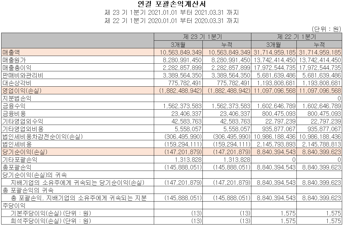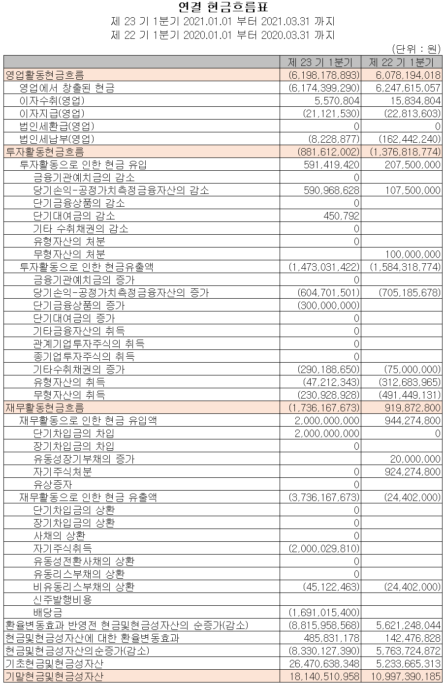지난 1분기 영업활동 현금흐름에서는 매출 채권, 재고 자산 등 운전 자산의 변동과 당기 적자 전환 등으로 총 62억 원의 현금이 유출되었습니다. 차입금을 조달하여 부채를 상환하고, 주주가치 제고를 위한 자기 주식을 취득하였으며 유무형 자산의 취득이 있었습니다. 2021년 1분기 말 기준 현금 및 현금성 자산은 전년 동기 대비 71억 원이 증가한 181억 원을 보유하고 있습니다.