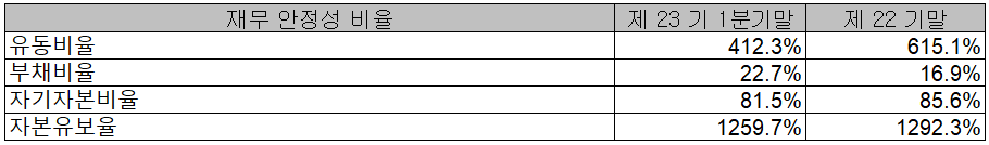 지난 1분기 당사의 재무 안정성 비율에서는 유동비율 412.3%, 부채비율 22.7%, 자기자본비율 81.5%, 자본 유보율 1,259.7%를 기록하면서 전반적으로 건실하고 안정적인 재무 구조를 유지하고 있습니다.