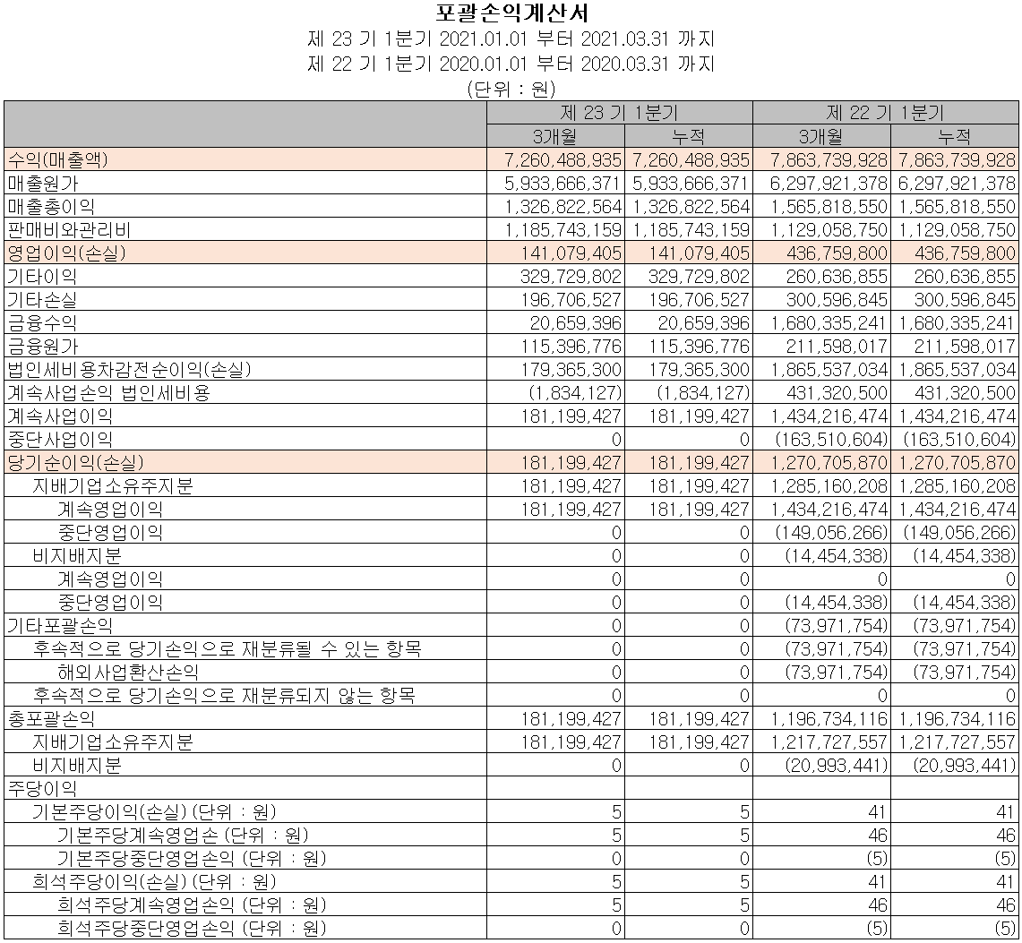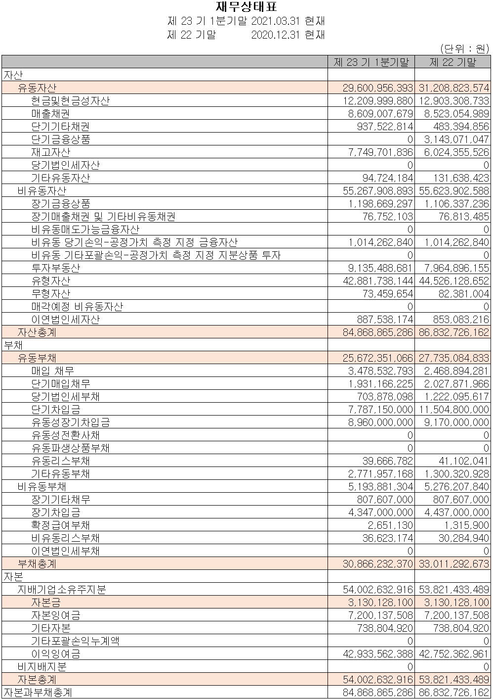 지난 1분기 자산 총계는 전기보다 2.3%(20억 원) 감소한 849억 원으로 단기금융상품 및 일부 유형자산의 처분에 기인합니다. 부채 총계는 6.5%(21억 원) 감소한 309억 원으로 단기차입금의 감소가 있었습니다.