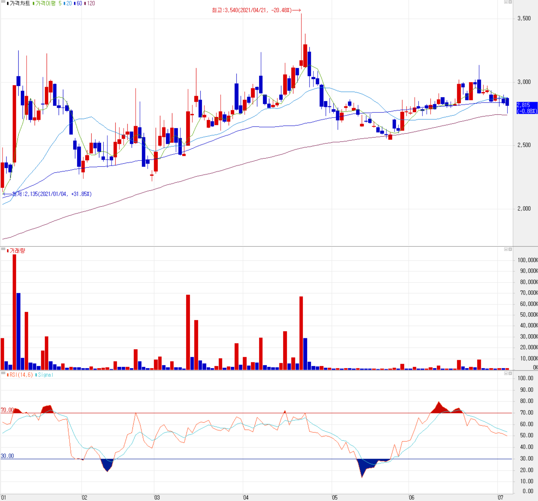 7월 5일 장 종료 기준 당사의 주가는 전 거래일보다 0.88% 내린 2,815원에 거래를 마쳤습니다. 외국인 비중은 0.67%이며, 시가 총액은 881억 원으로 코스닥 시총 상위 1,083위 종목입니다.