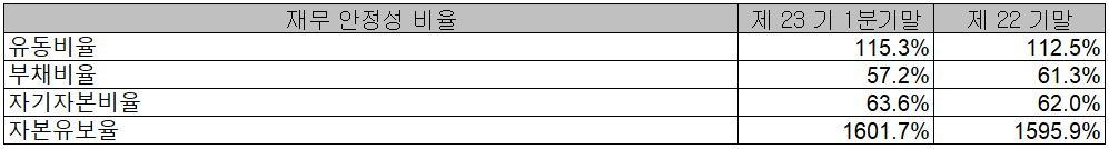 2021년 1분기 당사의 재무 안정성 비율에서는 유동비율 115.3%, 부채비율 57.2%, 자기자본비율 63.6%, 자본 유보율 1,602.7%를 기록하면서 전반적으로 안정적인 재무상태를 유지하고 있습니다.