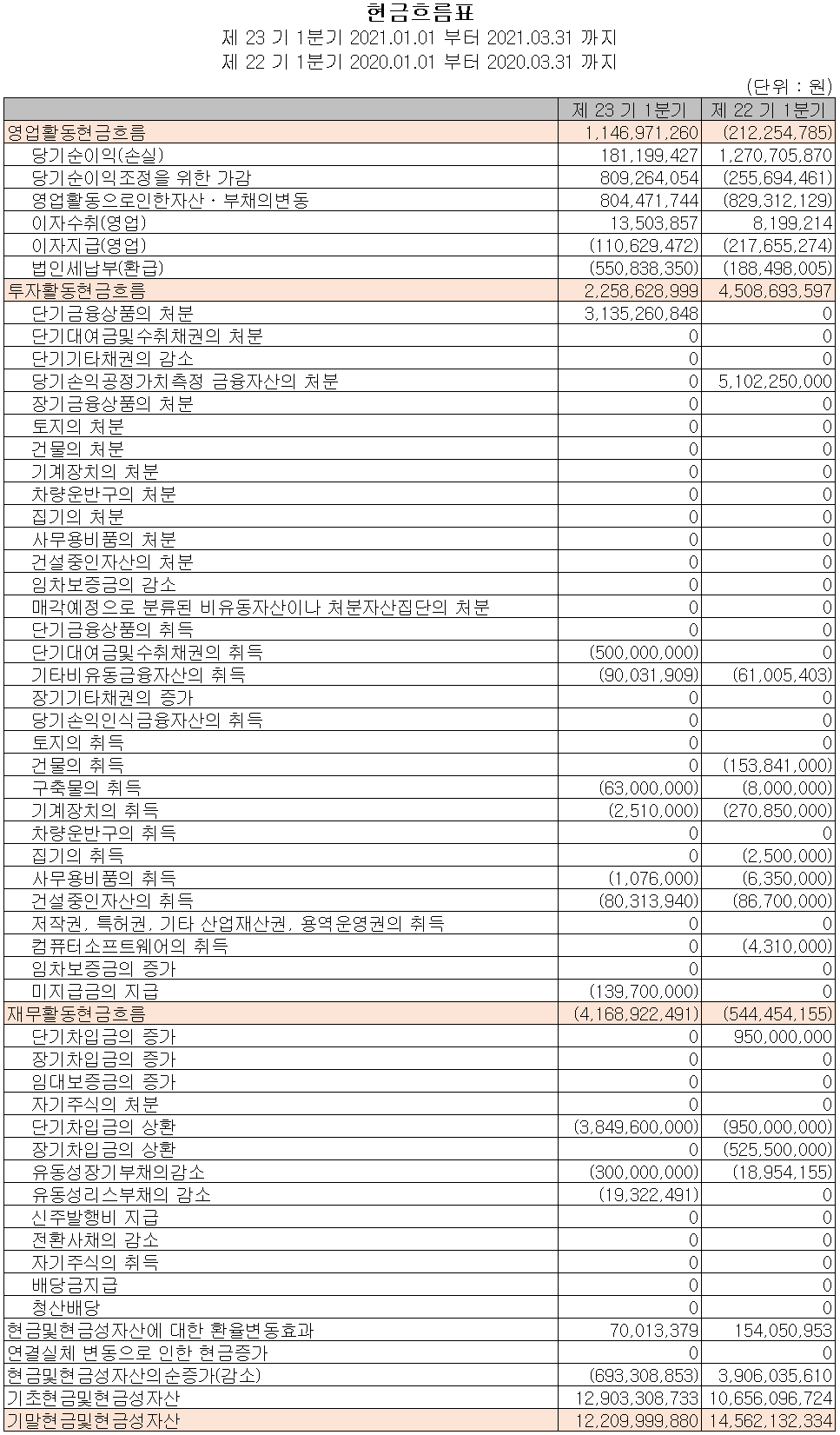 지난 1분기 영업활동 현금흐름에서는 총 11억 원의 현금이 유입되었으며, 일부 단기 차입금 및 유동성 장기 부채를 상환하였습니다. 투자활동에서는 단기 금융상품의 처분으로 총 23억 원의 현금이 유입되었습니다. 2021년 1분기 말 기준 현금 및 현금성 자산은 122억 원을 보유하고 있습니다.