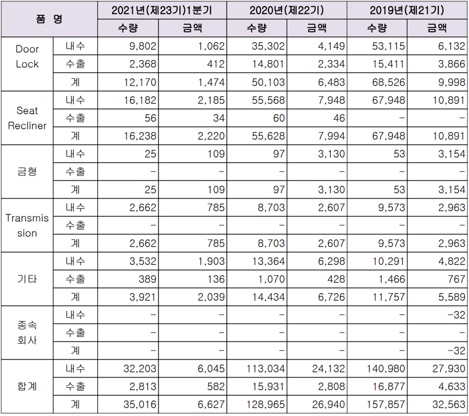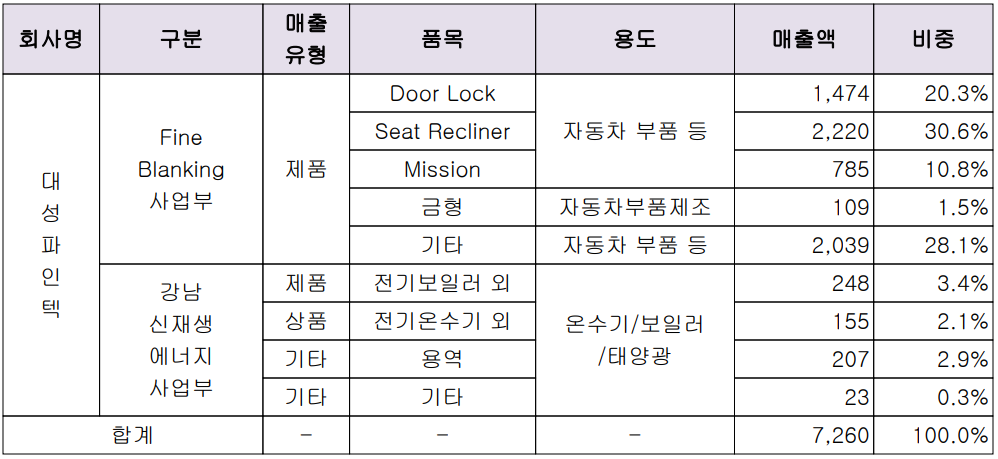 당사의 사업부문은 자동차 도어록, 시트 리클라이너, 미션 등 자동차 부품을 제조하는 Fine Blanking 사업부문과 전기보일러 및 온수기, 태양광 사업을 영위하는 신재생에너지 사업부문으로 구성되어 있습니다. 지난 1분기 자동차 Door Lock의 매출은 15억 원으로 전체 매출의 20.3%를 차지하였으며, Seat Recliner는 22억 원으로 30.6%, Mission은 7.8억 원으로 10.8%의 매출 비중을 보였고, 신재생 에너지 사업부문의 매출은 6.3억 원으로 8.7%의 매출 비중을 나타냈습니다.