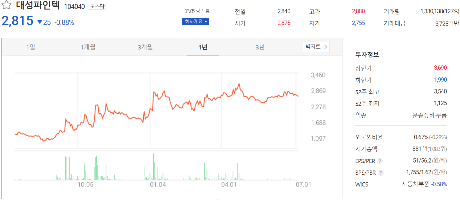 7월 5일 장 종료 기준 당사의 주가는 전 거래일보다 0.88% 내린 2,815원에 거래를 마쳤습니다. 외국인 비중은 0.67%이며, 시가 총액은 881억 원으로 코스닥 시총 상위 1,083위 종목입니다.