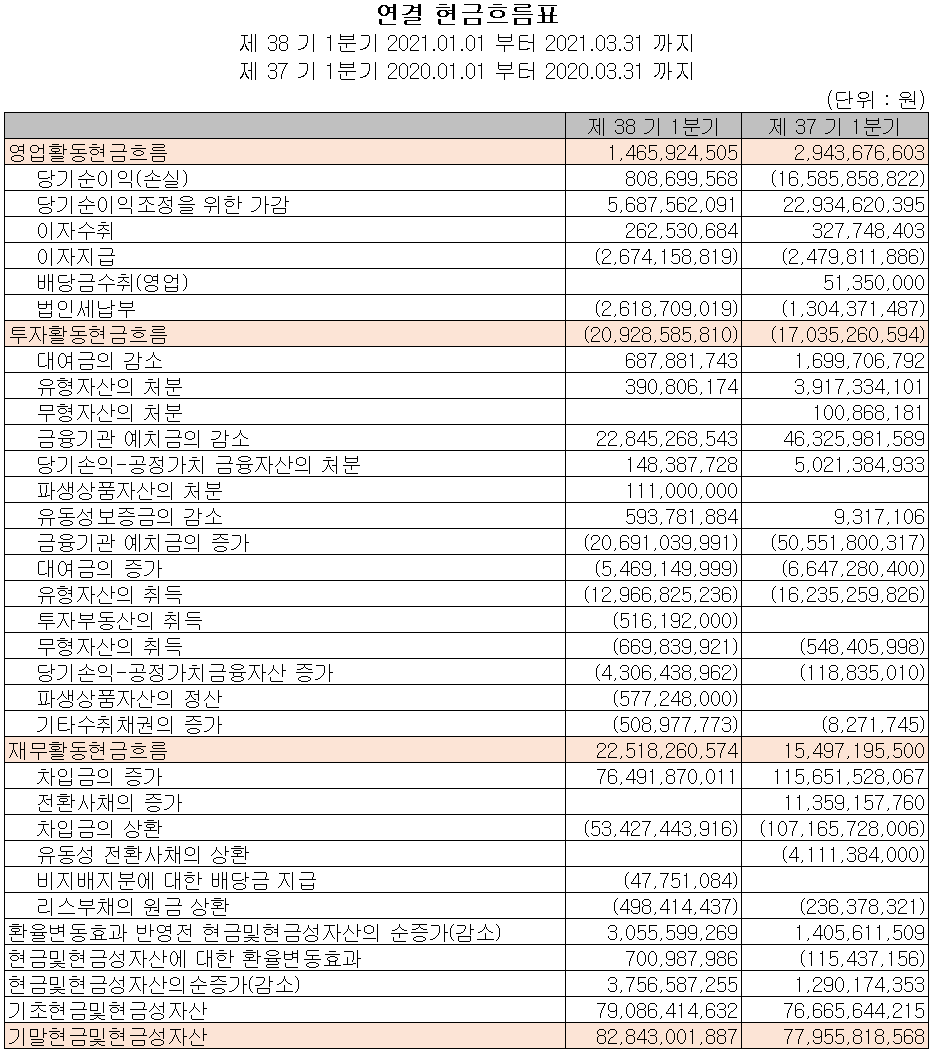 지난 1분기 영업활동 현금흐름에서는 총 15억 원의 현금이 유입되었으며, 부채를 상환하고 배당금을 지급하였습니다. 투자활동에서는 유무형 자산의 취득 등으로 총 209억 원의 현금이 유출되었습니다. 2021년 1분기 말 기준 현금 및 현금성 자산은 전년 동기 대비 49억 원 증가한 828억 원을 보유하고 있습니다.