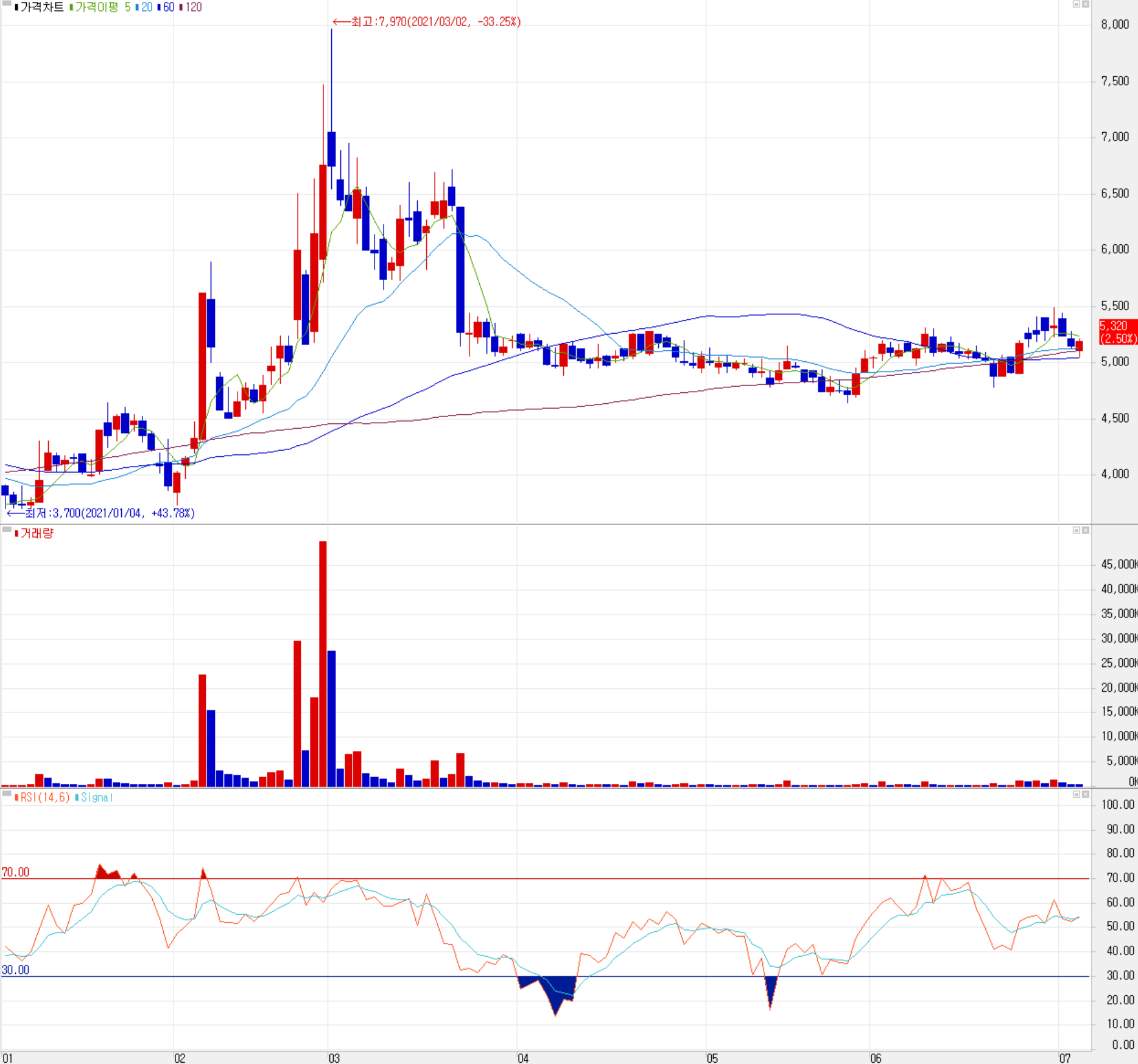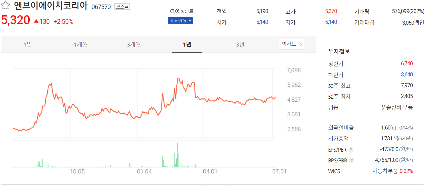 7월 6일 장 종료 기준 당사의 주가는 전일보다 2.5% 오른 5,320원에 거래를 마쳤습니다. 외국인 비중은 1.6%이며, 시가 총액 1,731억 원으로 코스닥 시총 상위 620위 종목입니다.