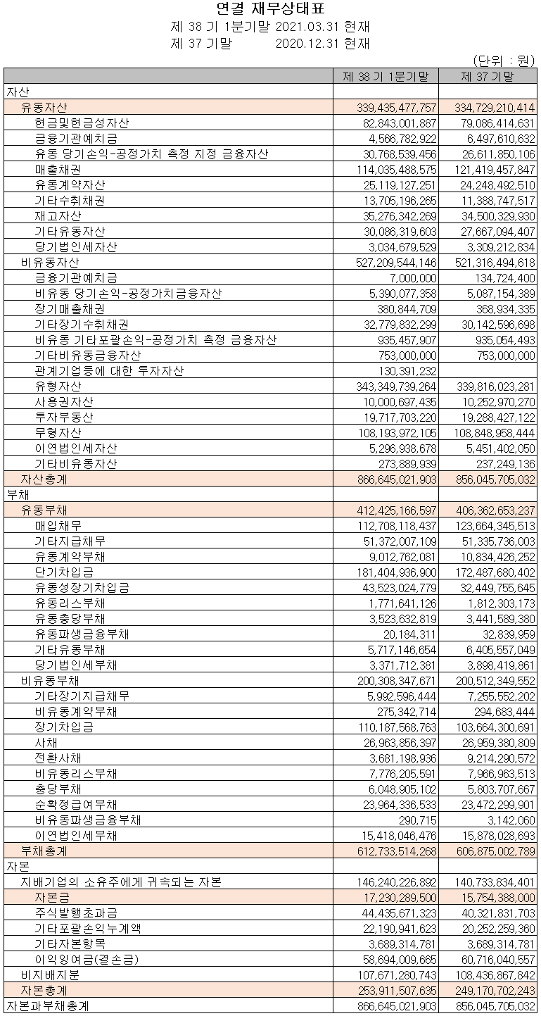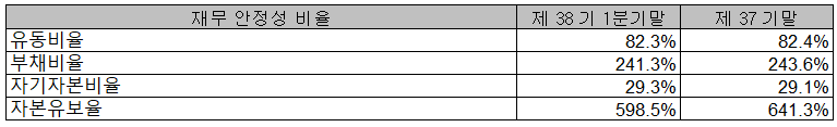 2021년 1분기 재무 안정성 비율에서는 유동비율 82.3%, 부채비율 241.3%, 자기 자본비율 29.3%, 자본 유보율 598.5%를 기록하였습니다. 사업 다변화의 일환으로 원방테크를 인수하면서 상승한 부채비율이 여전히 240%대로 높은 편이지만 2019년(제36기 말) 대비 감소하였으며, 바이오 클린룸, 2차 전지 드라이 룸 및 NVH배터리 시스템 합병에 따른 매출 등에서 성장을 기대하고 있습니다.