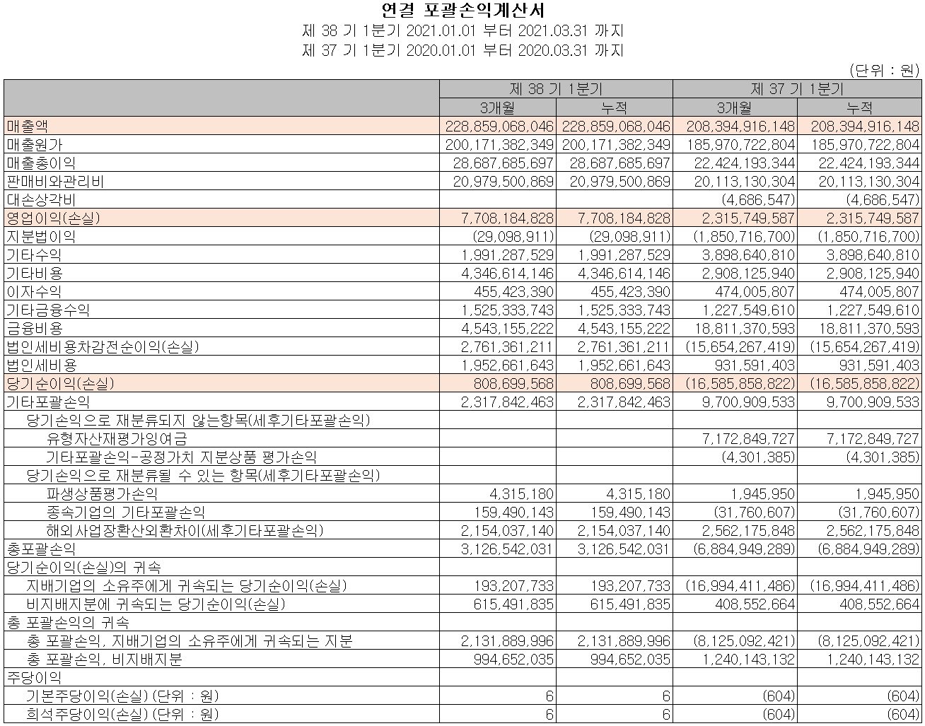 당사의 지난 1분기 실적은 매출액 2,289억 원으로 전년 동기 대비 9.8% 증가했고, 영업이익은 77억 원으로 232.9% 증가, 당기순이익은 8억 원으로 흑자 전환했습니다.