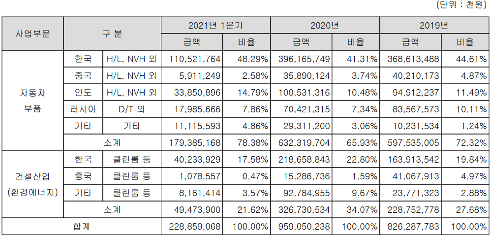 당사의 사업부문은 크게 기존 주력 사업인 NVH(소음진동 방지) 솔루션이 적용된 자동차의 내외장재 및 엔진 관련 부품을 생산하는 자동차 부품 사업부문과 바이오 클린룸 및 드라이룸 솔루션과 교량 거더 사업을 제공하는 건설산업 부문으로 구성되어 있습니다.