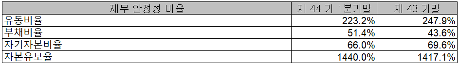 2021년 1분기 재무 안정성 비율에서는 유동비율 223.2%, 부채비율 51.4%, 자기 자본비율 66%, 자본 유보율 1,440%를 기록하면서 전반적으로 안정적인 재무상태를 유지하고 있습니다.