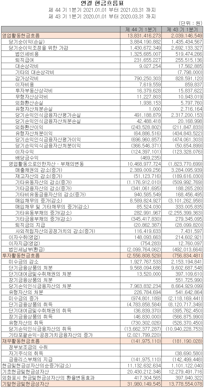 당사의 지난 1분기 영업활동 현금흐름에서는 운전 자산의 변동과 당기 순이익 등으로 총 138억 원의 현금이 유입되었습니다. 단기 금융상품의 취득이 있었으며, 유형 자산을 취득하였습니다. 2021년 1분기 말 기준 당사의 현금 및 현금성 자산은 전년 동기 대비 182억 원 증가한 320억 원을 보유하고 있습니다.