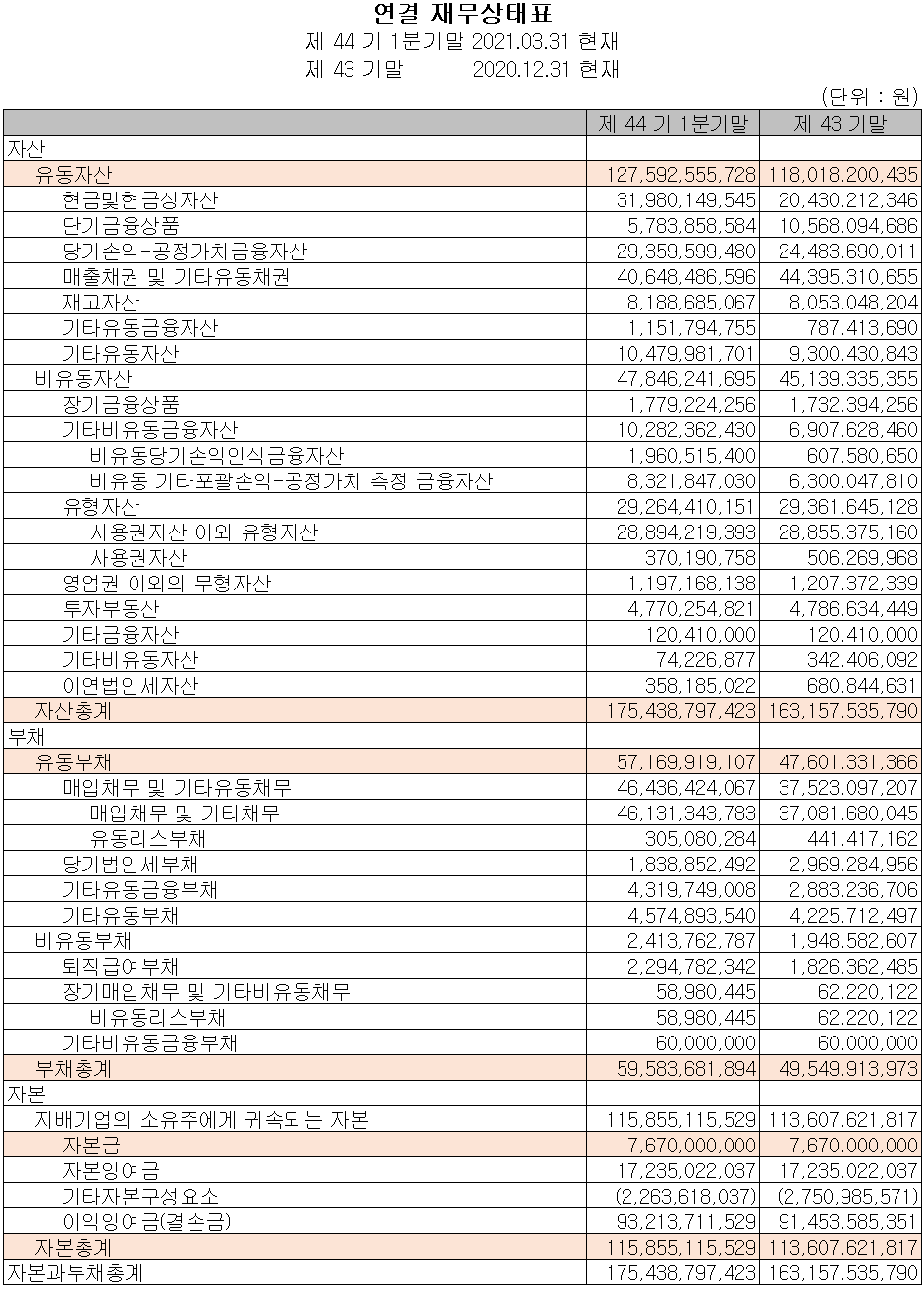 당사의 지난 1분기 자산 총계는 전기보다 7.5%(123억 원) 증가한 1,754억 원으로 현금 및 현금성 자산과 비유동 자산의 증가에 기인합니다. 부채 총계는 20.2%(100억 원) 증가한 596억 원으로 매입 채무 및 유동성 금융부채의 증가에 기인합니다.