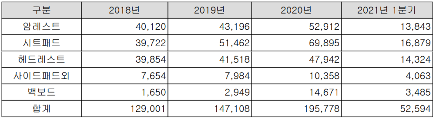 당사는 폼 패드 성형 기술 기반으로 다양한 자동차 시트 부품을 제조, 공급하는 단일 사업부문으로 구성되어 있습니다. 지난 1분기 시트패드의 매출은 169억 원으로 전체 매출액의 32%를 차지하였으며, 헤드레스트는 143억 원으로 27.2%, 암레스트는 138억 원으로 26.3%의 매출 비중을 기록했습니다.